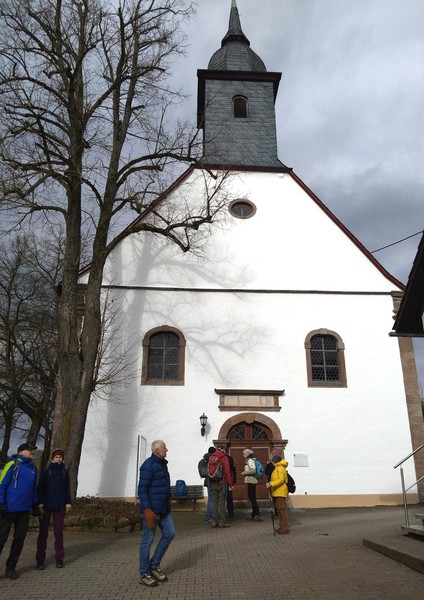 An der historischen Prot. Kirche wurde eine kleine Pause eingelegt (siehe Foto). Nun kam der steile Anstieg Richtung Potzberg. Auf halbem Weg bog man ab in Richtung Ausgangspunkt. Nach ca. 10 km und 280 Höhenmetern wurde In der Buchwaldhütte bei typisch pfälzischem Essen sowie Kaffee und Kuchen in geselliger Runde die Wanderung ausklingen gelassen.